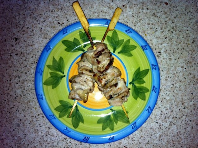 אחרי שיש לנו את הנוזל הזה, נחתוך את הבשר לקוביות "ביס", ככה שיהיה לנו קל לשפד אותן. ומייד אחרי החיתוך נשפד על שיפודים קטנים. אני משתמש בשיפודי "דגל" – אפשר לראות בתמונה את ה"דגל" הזה שמשמש בתור ידית אחיזה. היתרון הענק של השיפודים האלה הוא שקודם כל יותר נוח לאכול מהם, ודבר שני – זה גם חוסך לכם בשר פר מנה :).