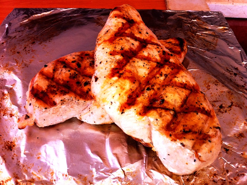 אז ניגש לעניין. מנקים את החזה עוף וחוצים אותו – מהכמות הזאת נקבל 4 חצאים. נשים את הבשר במגש אלומיניום, נתבל במלח גס, פלפל שחור וצ'ילי גרוס, נזלף מעל 3-4 כפות שמן זית ומיץ מחצי לימון. נהפוך את חצאי חזה העוף ונחזור על התהליך – מלח, פלפל שחור, צ'ילי גרוס, שמן זית ומיץ מחצי לימון. זמן ההשריה – כחצי שעה עד 40 דקות.