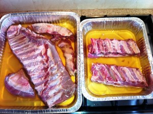 במגש חד פעמי גדול נמקם את הצלעות ונשפוך מעל את מיץ התפוחים. נוסיף את מיץ הלימון, נהפוך ונשאיר במקרר, מכוסה בניילון, לשעתיים – שלוש.