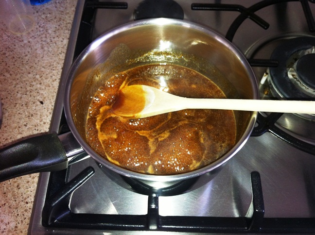 אוקיי. זה רותח? יופי! אש קטנה, משהו כמו 5-7 דקות, עם ערבוב מדי פעם, עד שהזיגוג מסמיך טיפה. זהו, מורידים מהאש ונותנים לזה להתקרר.