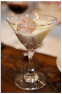 התפריט כלל 2 מנות פתיחה – קרפצ׳ו פילה עגל וסביצ׳ה פארידה, סלט ירוק עם צלפים ואנשובי, מרק פרגיות בחלב קוקוס וחמאת בוטנים, 2 מנות עיקריות – רוסטביף סינטה ושוק טלה ממולאת באורז, ערמונים ופירות יבשים, תוספת של תפוחי אדמה מושחמים וקינוח – מוס שוקולד אספרסו עם שייק פירות העונה. את הצד ה״מחמם״ יותר (ולמי שעדיין לא ממש בקיא בסלנג שלי – מדובר על אלכוהול :-)) סיפק והציג אשר חסון מחברת ״איסלה וויין״, חברת הבת של יבואנית המשקאות Wine & More. הוא הביא איתו את היינות Picpoul de Pinet בציר 2010 – יין לבן יבש וקליל, Château de Flaugergues בציר 2008 – יין אדום יבש, Chateau Lagrezette בציר 2004 – יין אדום יבש, כבד יותר מהקודם וגם יקר יותר, ובנוסף – Domaine Paul Blanck Gewürztraminer 2009 Alsace – יין חצי יבש, במתיקות קלה ונעימה, שהתלווה לקינוח. אני חייב לומר את האמת – היינות לא זכו לתשומת הלב שלי יותר מדיי, לרוב כי אני חסיד נאמן של ״אוקטן״ גבוה יותר – וויסקי וקוניאק. אבל התאמה של היין לבשר באמת הייתה מוצלחת – היין שדרג את חווית הטעם בצורה משמעותית!