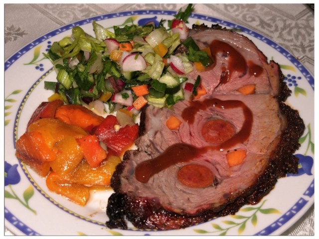 דבר ראשון – אנחנו צריכים "לשפד" את הנתח עם הגזר והקבנוס. עם סכין חדה (או מוט השחזה) עושים חורים לאורך הנתח. ודוחפים לשם את הקבנוס ואת רצועות הגזר. אחר כך – קושרים את הנתח היטב עם חוט קצבים. מה שיתקבל לכם זה משהו כזה: