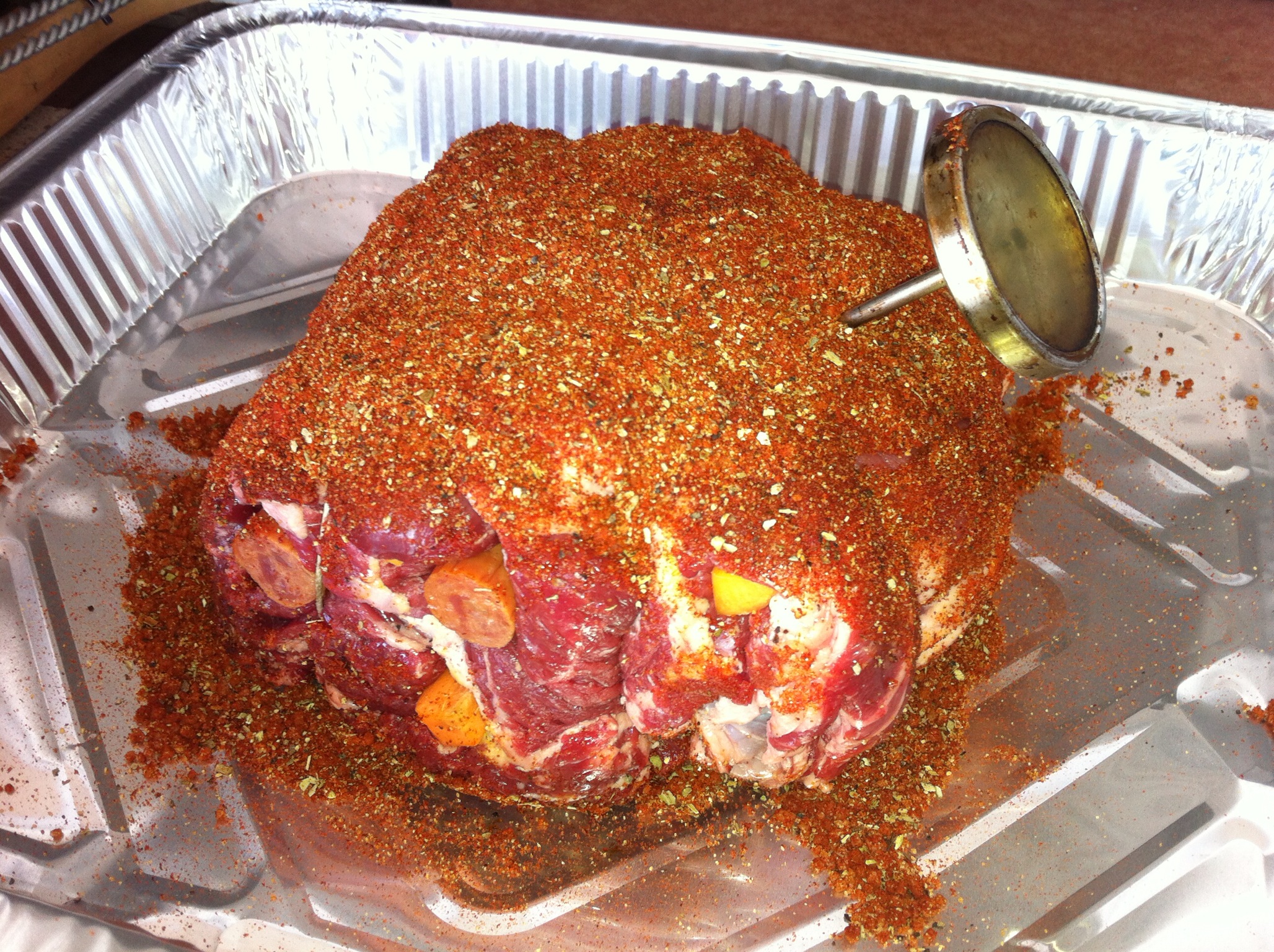 כעת – הצליה . כמובן, צליה עקיפה, חום בינוני – 170-180 מעלות. כמה זמן? אפשר לחשב בערך 18 דקות לכל חצי קילו בשר, אבל אני מעדיף את השיטה הבטוחה של מדחום לבשר. אתם מחפשים את החום הפנימי של 57-58 מעלות למדיום. כרגיל, לא ממליץ להמשיך מעבר לזה.