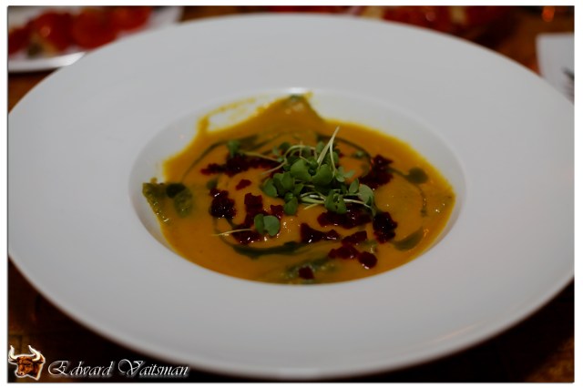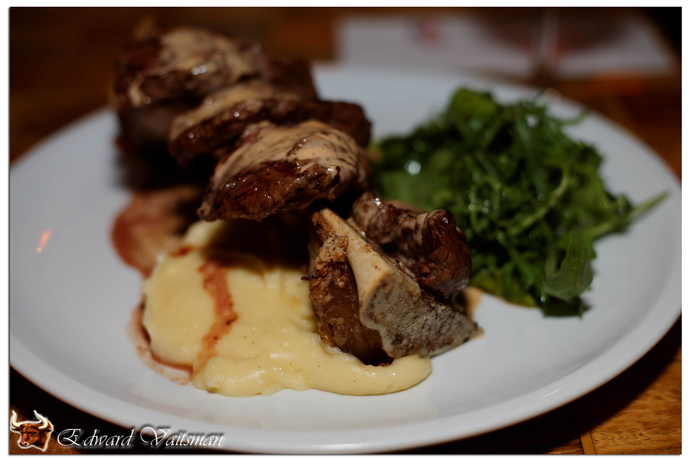 עכשיו – שימו לב… זאת מנה לא מסובכת ולא חדשנית במיוחד, אבל! צורת ההגשה! אני לא ראיתי כזה דבר עדיין. נתחי פילה בקר צלויים במידת צליה מושלמת מוגשים על עצם מח, ברוטב שמנת וכמהין, על מצע של פירה תפוחי אדמה. מיכאל סיפר, שהוא רצה להוזיל את המנה בכך שהיה מגיש את זה ללא העצם, אבל השף אלרן נלחם בשיניו על הפרזנטציה הזאת, וניצח. יודעים מה? אני בצד של אלרן! נראה מגניב לחלוטין! מחיר – 118 שקלים.