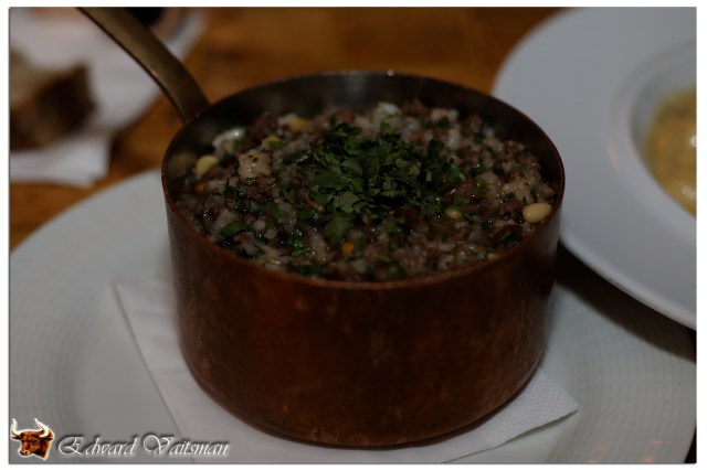 או את זו – פטה כבד עם ריבת עגבניות שרי. את המנה הזאת מיכאל מגיש לפי המתכון הקלאסי של קורדון בלו – הכבדים נטחנים עם כל שאר המרכיבים ונאפים בתנור, וזאת להבדיל מהגישה היותר מקובלת של להכשיר את הכבדים ברשת קודם. מחיר – 48 שקלים.