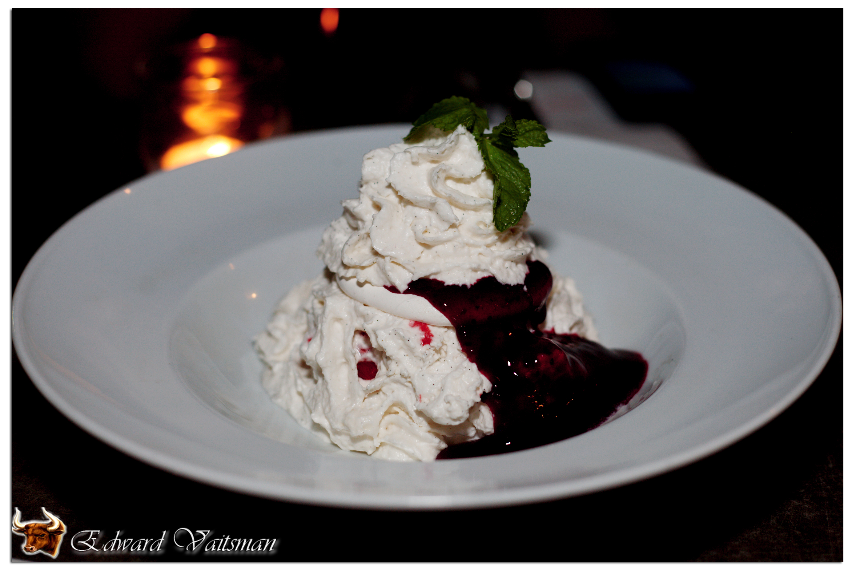 ופבלובה על בסיס מרנג עם רוטב פירות יער, גלידה וקצפת… מיכאל אמר שבתוך הפבלובה היה עוד משהו אבל… אני כבר הייתי במקום אחר מההנאה 🙂