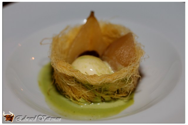 מיכאל בחר שתי מנות שונות לחלוטין – מן סוג של קן מקדאיף לאגסים ביין, וגלידה וכדור מרציפן: