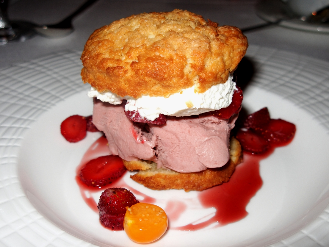 והנה הקינוח – עוגיית תותי שדה ודומדמניות עם גלידת תות וקצפת.
