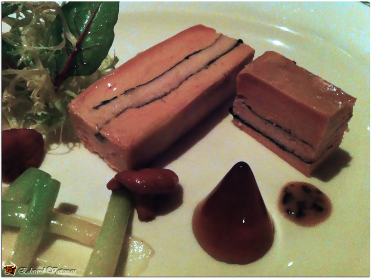מכאן – למנה הראשונה של הערב. טרין כבד אווז ועוף גינאה עם פטריות כמהין, שהוגש לצד פטריות יער, גבעולי בצל ירוק ועלי סלק צעירים. החלק המיוחד בטרין הוא שילוב של העדינות של כבד אווז עם המרקם היותר דחוס של עוף הגינאה, כשבין השכבות – פטריות כמהין. חוויה שונה לגמרי מכל הטרינים מכבד אווז שטעמתי עד כה.