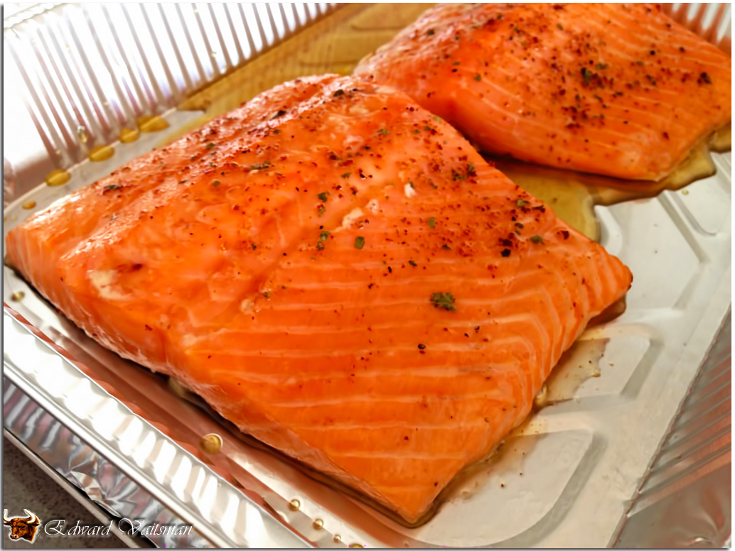 המנה הזאת במקור הגיעה מספר אמריקאי, שנקרא "Slow Fire – The Beginners Guide to Barbecue". קניתי את הספר בארה"ב, ואני חייב לציין, שרוב המתכונים שם מעניינים ודיי קלים לביצוע. את המתכון הזה אני שיניתי קצת, כדי שיתאים לא רק לגריל או מעשנת, אלא גם לתנור. אוקיי, בתנור לא תקבלו את הטעם המעושן, אבל הדג עצמו יהיה כל כך עסיסי, רך וטעים, שלא תרצו להכין סלמון אחר כך בשום דרך אחרת.