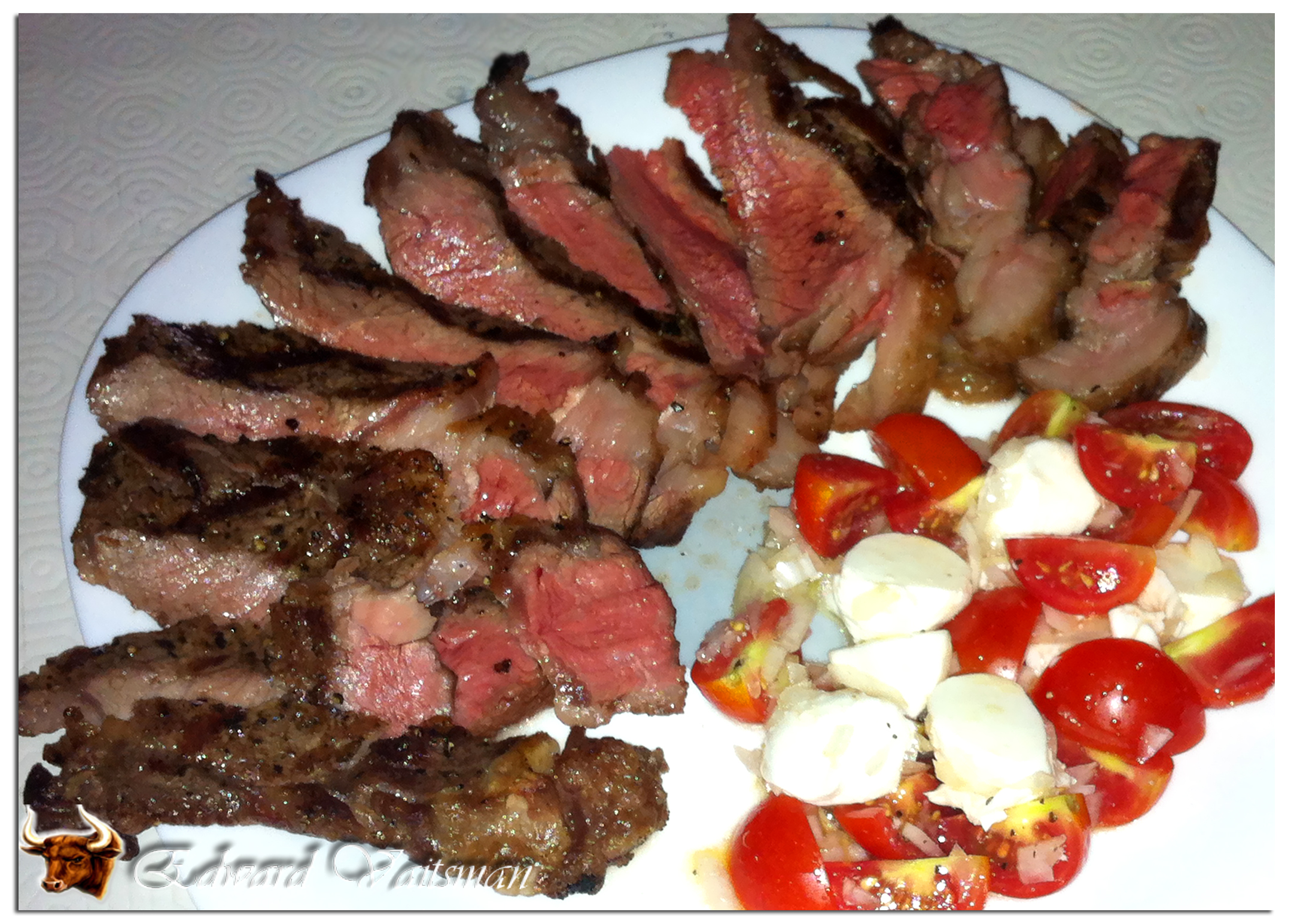 אנטריקוט על עצם (Prime rib) וסלט עגבניות שרי ופטריות צלויות.