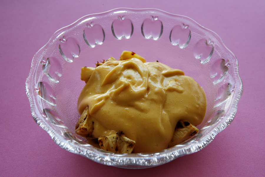 אננס צלוי בקרמל קוקוס, שמוגש עם סורבה קוקוס – כן, זה הרבה קוקוס :).